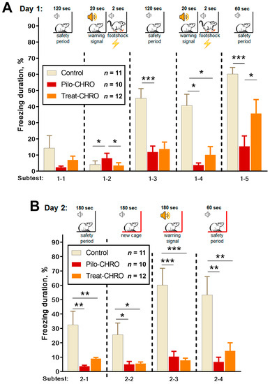 Fear memory was assessed using the fear conditioning test based on the time of freezing in response to a pain-associated stimulus. On Day 1, we observed a disturbance in fear reaction in the Pilo-CHRO group; the duration of freezing after foot shocks (Subtests 1–3 and 1–5) was smaller than in the control group (Figure 11A). In the group treated with anakinra, the duration of freezing was between that of the control and epileptic groups. These results indicate that anakinra therapy had a positive effect on short-term memory in the fear conditioning paradigm.