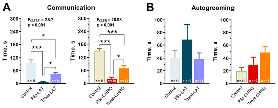 Using the paradigm of social interaction test, we found a decrease in time spent in active social interaction among post-SE rats in the latent and chronic phases. Anakinra therapy significantly improved communicative behavior during both stages of the model (Figure 12A). However, the duration of communicative acts did not get control values.