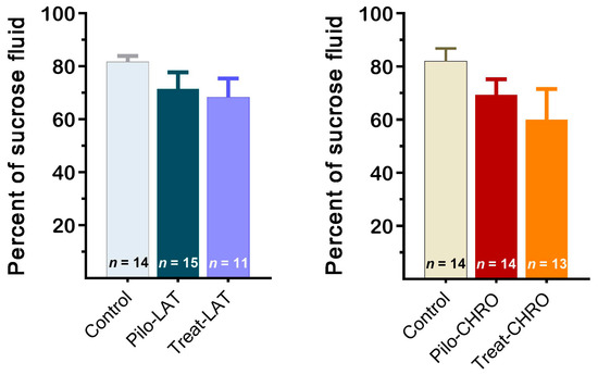 The percentage of sucrose solution consumption was similar in different groups of rats. Pilo-LAT and Pilo-CHRO: rats with pilocarpine-induced SE studied during the latent phase and chronic phase of the model accordingly; Treat-LAT and Treat-CHRO: post-SE rats treated with anakinra and studied during the latent phase and chronic phase of the model.