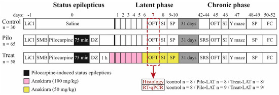 The design of the study is shown in Figure 14. The experiments were performed during the latent and chronic phases of the model using three groups of rats: (1) control (administered with saline instead of pilocarpine), (2) Pilo (rats administered with pilocarpine that developed SE), and (3) Treat (post-SE anakinra-treated rats).