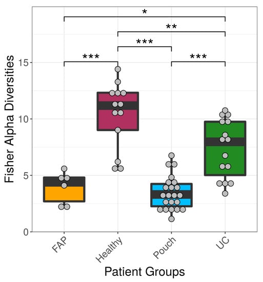 To quantify within-group (e.g., Healthy group, FAP group) diversity from 16S rRNA data, we used the vegan R package to calculate the most commonly used alpha diversity indices [34,35] (Fisher index, Figure 1 and Figure S1; Shannon and inverse Simpson indices, Figure S2, Table S2). Unweighted Unifrac distances (Figure 2 and Table S3) were computed with Phyloseq (version 1.22.3 R package) [36] and pairvise permANOVA analysis was calculated with the pairwiseAdonis R package.