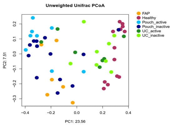 Principal coordinate analysis plot based on unweighted UniFrac distances showing the separation of different groups based on pairwise permANOVA test, except FAP from Pouch active and Pouch inactive groups, Pouch active from Pouch inactive group and UC active from UC inactive group. Sample sizes were 6, 13, 9, 13, 7 and 8 for FAP, Healthy, Pouch active, Pouch inactive, UC active and UC inactive groups, respectively. For details, see Table S3.