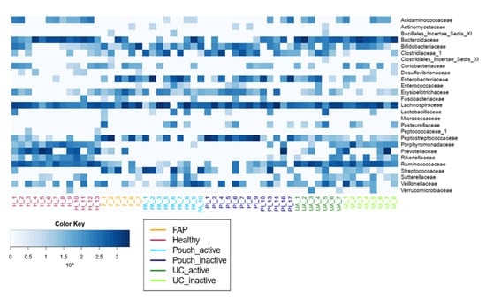 Family level diversity heat map. Bacterial abundances and differences in the abundance of bacterial families between groups are presented in Table S4a and Table S4b, respectively. Sample sizes were 6, 13, 9, 13, 7 and 8 for FAP, Healthy, Pouch active, Pouch inactive, UC active and UC inactive groups, respectively. Abbreviations: H—Healthy, F—FAP, PA—Pouch active, PI—Pouch inactive, UA—UC active, UI—UC inactive.