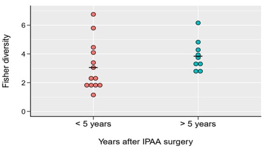 Fisher diversity indices of mature (>5 years elapsed after IPAA surgery) and immature (<5 years elapsed after IPAA surgery) UC pouch (Pouch) samples. No significant difference was observed between the two groups (p = 0.2036 from Welch two sample t-test. For details, see Table S5_ all_ data final).