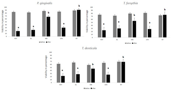 MTT assay showing relative percentage of P. gingivalis, T. forsythia and T. denticola biofilm viability with different treatment groups. Dissimilar letters indicate statistical significance between groups using ANOVA test followed by Tukey’s test.