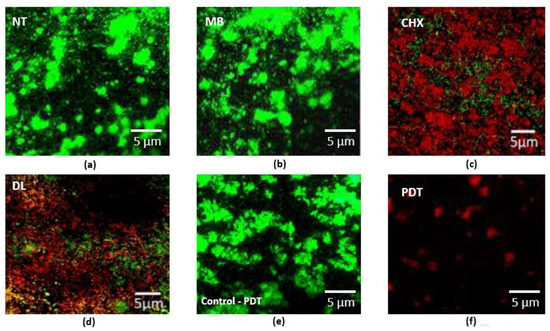 The CLSM images of bacteria cultured on PICN discs are shown in Figure 2. The dense green colonies (Figure 2a,b) with almost no area of dead bacterial cells represent the NT and MB specimens respectively. The bacteria with the CHX group (Figure 2c) and DL (Figure 2d) groups appeared dead with few areas of surviving green stained bacteria. The PDT group (Figure 2f) showed the highest dead cell count (p < 0.05). Figure 2e,f demonstrates pre-and post-treatment using PDT indicating the highest dead cell count and destroyed bacteria.