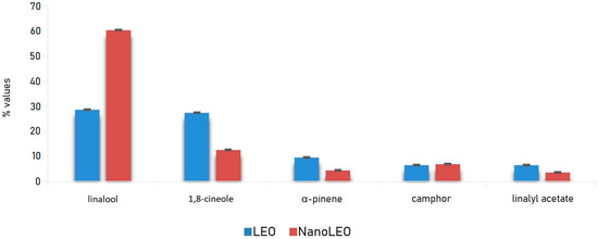Bar graph of the values (%) of major compounds detected in lavandin essential oil (LEO) and nanoemulsion of lavandin essential oil (NanoLEO). p < 0.05 according to ANOVA test.