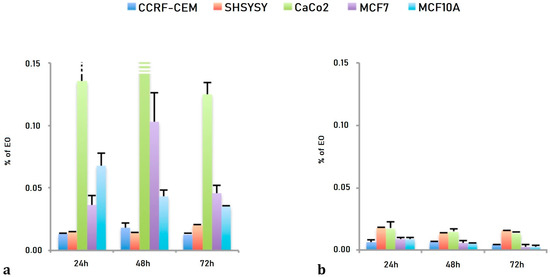 The NanoLEO treatments demonstrated both a dose an time dependent effects: ranging from 0.57 × 10−2 ± 0.08 × 10−2% for 24 h to 0.87 × 10−2 ± 0.05 × 10−2% for 72 h for CCRF-CEM cells; from 0.64 × 10−2 ± 0.05 × 10−2% for 24 h to 0.44 × 10−2 ± 0.02 × 10−2% for 72 h for SHSY5Y; from 1.79 × 10−2 ± 0.53 × 10−2% (24 h) to 1.58 × 10−2 ± 0.09 × 10−2% for 72 h for Caco-2 cells; from 1.73 × 10−2 ± 0.10 × 10−2% for 24 h to 1.35 × 10−2 ± 0.21 × 10−2% for 72 h for the MCF7 cells; from 0.90 × 10−2 ± 0.14 × 10−2% for 24 h to 0.25 × 10−2 ± 0.14 × 10−2% for 72 h for the MCF10A cells (Table 2).