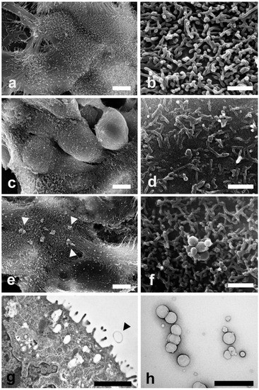 After 4 and 24 h, the cells were collected in tubes, washed with PBS and fixed with 4% paraformaldehyde and 5% glutaraldehyde, pH 7.2, in a 0.1 M cacodylate buffer for 1 h at 4 °C [64]. After rinsing overnight in the same buffer, samples were post-fixed in 1% osmium tetroxide in a cacodylate buffer for 1 h at 4 °C. After two washings in the same buffer, samples were dehydrated in a graded ethanol series.