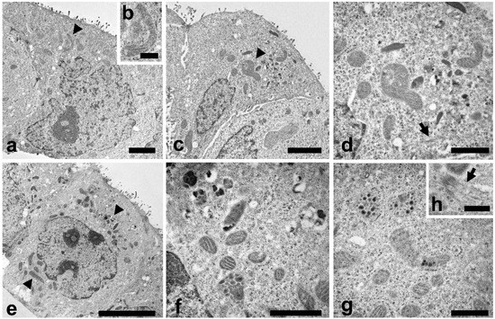TEM analysis were also carried out to study the cell ultrastructure (Figure 4). In control cells a typical cytoplasmic organization can be observed (Figure 4a), with a regular nucleus, endoplasmic reticulum, Golgi apparatus and numerous normal shaped mitochondria (Figure 4a, arrowhead). A higher magnification of mitochondrion is reported in Figure 4b.