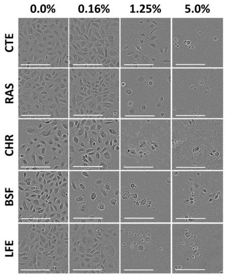 - Jamalzadeh, L.; Ghafoori, H.; Sariri, R.; Rabuti, H.; Nasirzade, J.; Hasani, H.; Aghamaali, M.R. Cytotoxic effects of some common organic solvents on MCF-7, RAW-264.7 and human umbilical vein endothelial cells. Avicenna J. Med. Biochem. 2016, 4, e33453. [Google Scholar] [CrossRef]