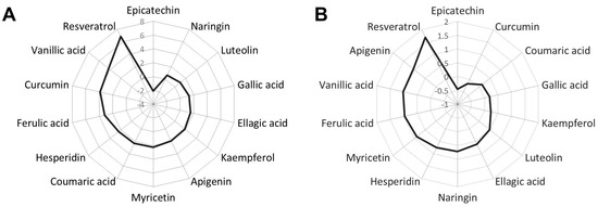 Chemicals were obtained from SIGMA Aldrich (St. Louis, MO, USA): Hesperidin analytical standard, ≥97.0% (HPLC, ref. # 50162; PubChem CID: 10621); Naringin ≥95% (HPLC, ref. #71162; PubChem CID: 442428); Apigenin ≥97% (TLC) from parsley powder (ref. #A3145; PubChem CID: 5280443); Luteolin analytical standard, ≥97.0% (HPLC, ref. # 72511; PubChem CID: 5280445); Kaempferol ≥90% (HPLC, ref. # K0133; PubChem CID: 5280863); Myricetin analytical standard, ≥98% (HPLC, ref. #72576; PubChem CID: 5281672); Resveratrol ≥99% (HPLC, ref #R5010; PubChem CID: 445154); Curcumin from Curcuma longa (Turmeric) powder (ref. #C1386; PubChem CID: 969516); p-Coumaric acid ≥98.0% (HPLC, ref. #C9008; PubChem CID: 637542); Ellagic acid powder from tree bark ≥95% (HPLC, ref. #E2250; PubChem CID: 5281855); trans-Ferulic acid >99%, (ref. #128708; PubChem CID: 445858); Gallic acid 97.5-102.5% (titration), (ref. #G7384; PubChem CID: 370); Vanillic acid purum ≥97.0% (HPLC, ref. #94770; PubChem CID: 8468). All reagents were dissolved in dimethyl sulfoxide (DMSO).