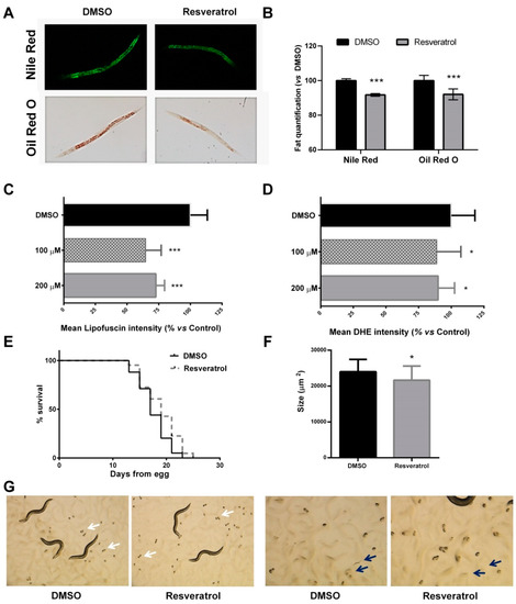 Resveratrol increases C. elegans healthspan. (A) Nile Red and Oil Red O staining of DMSO- and resveratrol-treated worms. (B) Nile Red and Oil Red O quantification of DMSO- and resveratrol-treated worms (100 µM). The results are expressed as the mean ± SD relative to DMSO-treated worms. Significance refers to the effect of resveratrol with respect to DMSO control worms (Student’s t-Test, *** p < 0.001). (C) Quantification of lipofuscin aging pigment of resveratrol-treated worms compared to DMSO control worms (mean ± SD relative to DMSO-treated worms). Significance refers to the effect of resveratrol with respect to DMSO control worms (ANOVA followed by LSD test, *** p < 0.001). (D) Quantification of the ROS production (measured by DHE) in resveratrol-treated worms compared to DMSO control worms (mean ± SD relative to DMSO treated worms. Significance refers to the effect of resveratrol with respect to DMSO control worms (ANOVA followed by LSD test, * p < 0.05). (E) Lifespan analysis of resveratrol-treated worms compared to DMSO control worms. (F) Size of the treated- and untreated worms on day 1 of adulthood. Significance refers to the effect of resveratrol with respect to DMSO control worms (Student’s t-Test, * p < 0.05) (G) Microscope observation of the presence of eggs (white arrows) and L1 larvae (blue arrows) in both DMSO- and resveratrol-supplemented plates.