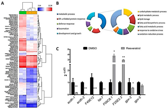 Comparison of the gene expression of resveratrol (200 µM) vs. DMSO-treated worms. (A) Hierarchical clustering analysis of control (green) and resveratrol (yellow) samples. (B) Gene Ontology biological processes enriched in resveratrol-treated worms compared with DMSO. (C) qPCR analysis of genes differentially expressed in microarray analyses. Results are expressed as the fold difference expression levels of each gene in the resveratrol-treated group compared with the DMSO control group, calculated with the 2−∆∆Ct method. Significance refers to the effect of resveratrol with respect to DMSO control worms (Wilcoxon test, * p < 0.05; ** p < 0.01; *** p < 0.001).