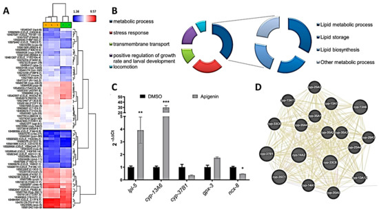 Gene expression microarray comparison of apigenin (100 µM)-treated worms vs. DMSO control worms. (A) Hierarchical clustering analysis of apigenin (yellow) and DMSO (green) samples. (B) Gene Ontology biological processes enriched in apigenin-treated worms compared with DMSO control group. (C) qPCR analysis of genes differentially expressed in microarray analyses. Results are expressed as the fold difference expression levels of each gene in the apigenin-treated group compared with the DMSO control group, calculated with the 2−∆∆Ct method. Significance refers to the effect of resveratrol with respect to DMSO control worms (Wilcoxon test, * p < 0.05; ** p < 0.01; *** p < 0.001). (D) Interaction network obtained from GeneMANIA of the most related genes connected with cyp P450 observed after treatment with apigenin.