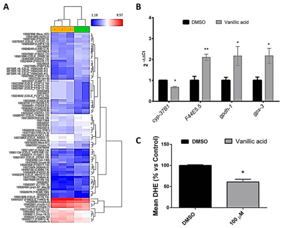 Gene expression microarray comparison of vanillic acid (100 µM)-treated worms vs. DMSO control worms. (A) Hierarchical clustering analysis of vanillic acid (yellow) and DMSO (green) samples. (B) qPCR analysis of genes differentially expressed in microarray analyses. Results are expressed as the fold-difference expression levels of each gene in the vanillic acid-treated group compared with the DMSO control group, calculated with the 2−∆∆Ct method. Significance refers to the effect of vanillic acid with respect to DMSO control worms (Wilcoxon test, * p < 0.05; ** p < 0.01). (C) Quantification of the ROS production (measured by DHE) in vanillic acid-treated worms compared with DMSO control worms (mean ± SD relative to DMSO-treated worms). Significance refers to the effect of vanillic acid with respect to DMSO control worms (Student’s t-Test, * p < 0.05).