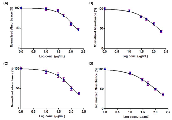 SRB assay on HEK293 cells to evaluate the effect of the four plant extracts: (A) XA, (B) IC, (C) EG and (D) DP on the cell growth after 48 h (X-axis: log concentrations of extracts from 1 to 200 (µg/mL) and Y-axis: the percentage of normalized absorbance). Values are mean ± SD of three independent experiments.