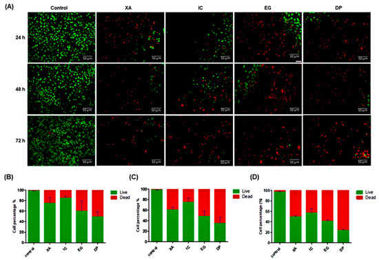 A live/dead assay was performed to confirm the cytotoxic activity of the four plant extracts against HeLa cell line. Cells were treated with a concentration of 30 µg/mL of each crude extract over 24, 48 and 72 h. Then, dual staining with fluorescence dyes was performed using calcein-AM and propidium iodide. The results showed a significant decrease in viable cells after being with the extracts (Figure 4A). Data confirmed the cytotoxic activity of these extracts with time dependent manners. As the percentage of viable cells of untreated cells was 97.10 ± 0.8% after 72 h, while the percentage of viable cells decreased to 75.36 ± 5.5%, 60.36 ± 4.3% and 49.46 ± 3.8% after cell treatment with XA over 24, 48 and 72 h, respectively. After treatment of cells with IC, viable cells decreased to 85 ± 2.4%, 75.25 ± 5.7% and 56.79 ± 4.9% over 24, 48 and 72 h, respectively. The percentage of viable cells dramatically decreased, upon treatment of cells with EG to 59.77 ± 5.9%, 48.28 ± 3.1% and 41.35 ± 2.4% over 24, 48 and 72 h, respectively. The results confirmed that DP was shown a potent cytotoxic activity towards HeLa cells, as the percentage of viable cells significantly decreased to 49.30 ± 4.1%, 34.72 ± 3.5% and 23.64 ± 1.2% over 24, 48 and 72 h, respectively (Figure 4B–D). These results suggest that the four studied plant extracts are potential cytotoxic agents for the studied cell lines.