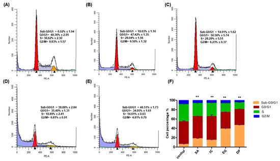 Cell cycle analysis by flow cytometry for HeLa cells treated with IC50 of the different studied plant extracts for 48 h: (A) Control, (B) XA, (C) IC, (D) EG and (E) DP. While, (F) Comparative analysis among different plant extracts for Sub-G0/G1, G0/G1, S and G2/M Phases. The cell cycle distribution was analyzed by ModFit LT software. All results are expressed in the histogram as total percentages of cells from four different groups with mean ± SD of three independent determinations. All data collected from experiments were performed in three replicates and analyzed using the one-way analysis of variance (ANOVA) at a significance level of p < 0.05 and indicated by **.