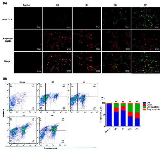 Detection of apoptosis and necrosis using Annexin V-FITC and PI dual staining after 48 h of treatment of HeLa cells with IC50 of the studied crude extracts XA, IC, EG and DP in comparison to untreated cells. (A) Images by fluorescent microscopy represent one of the three independent experiments, (B) Results, after flow cytometry analysis, are expressed in the histogram as total percentages of cells from four different quadrants (Q1 = early apoptosis, Q2 = late apoptosis, Q3 = necrosis, Q4 = live), with mean ± SD of three independent determinations. All results are expressed in the histogram as total percentages of cells from four different groups with mean ± SD of three independent determinations. (C) Bar graph for values of cell percentages, expressed in mean ± standard deviation (SD) and analyzed using the one-way analysis of variance (ANOVA) at a significance level of p < 0.05 and indicated by **.
