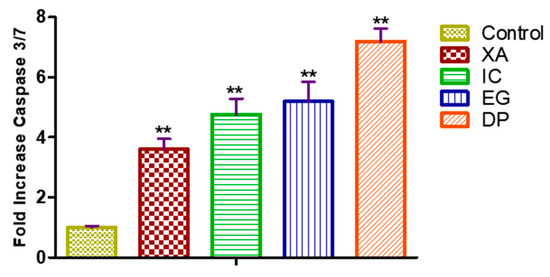 To investigate whether the apoptosis effect induced by the four studied plant extracts is dependent upon the caspases activation, the caspase 3/7 activity examined on HeLa cells treated with the concentration of IC50 values of the four studied extracts for 24 h (Figure 7). DP expressed a significant effect on activation of caspase 3/7 up to 7.17 ± 0.72 fold compared to the untreated cells. As well, EG efficiently enhanced the caspase 3/7 activity by 5.15 ± 1.14 fold, while cells treated with XA and IC expressed an increase in the activities of caspase 3/7 by 3.60 ± 0.58 and 4.75 ± 0.92 fold compared to the untreated cells that expressed only 1.12 ± 0.19 fold increase in activity.