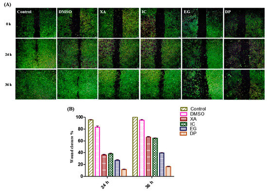 Effect of the plant extracts on cell growth; Scratching was performed using a 200 µL pipette tip. (A) Metastatic progression by scratch test. While, (B) Time dependent cell wound closure % under the influence of the four plant extracts XA, IC, EG and DP compared to control (un-treated cells) and cells treated with vehicle (0.1% DMSO) as negative control. Values expressed in mean ± standard deviation (SD).
