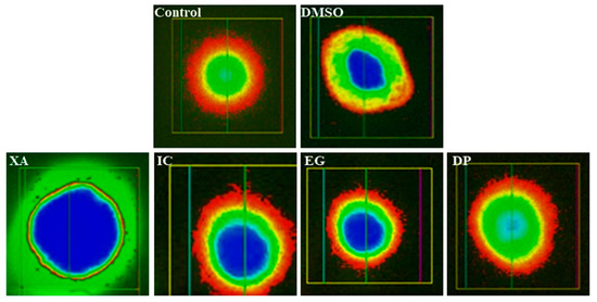According to Figure 10, it can be observed that no direct DNA strand breakage was caused by IC50 levels of the three of the studied plant extracts—IC, EG and DP—compared to the untreated cells and vehicle control (0.1% DMSO). While IC50 of the plant extract XA might interfere with low DNA damage. Several parameters including percentage of DNA in comet tail (% tail-DNA), tail length (TL), and tail moment (TM) were used in the past to monitor DNA strand-breakage with the comet assay. In this study, the percentage of tail-DNA was used to quantify DNA strand-breakage in Hela cells after 24 h of treatment with the plant extracts. Data in Table 1, confirmed the results as IC, EG and DP exhibited percentage (% tail-DNA) <10% which represent the value for undamaged nuclei, while XA shown value (% tail-DNA) of 19.04 ± 2.10% that indicate low-damaged nuclei [40]. From these results, it can be assumed that these plant extracts can be used in in-vivo studies with no or minimum incidence of genetic toxicity.