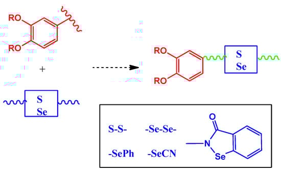Free phenolic derivatives can scavenge free radicals upon reaction with free phenolic hydroxyl groups, to give quinone-type intermediates [33] (sacrificial antioxidants), converting ROS into non-radical species, like alcohols or water; in this sense, phenolic compounds act as chain-breaking or primary antioxidants, probably the most important family of natural compounds having such antioxidant mechanism. The antioxidant properties of organochalcogen, particularly organoselenium derivatives, are diverse, and therefore, they might be useful against different targets in oxidative stress, an activity elicited by their exceptional redox properties. Such activities include scavenging of free radicals [60], metal complexation [61], or mimicry of natural antioxidant enzymes for the removal of deleterious hydrogen peroxide and alkyl peroxides (e.g., GPx), the so-called bioinspired antioxidants [46]. Interestingly, diselenides and selenides can be substrates in vivo for mammalian thioredoxin reductase (TrxR), furnishing selenols/selenolates, stronger nucleophiles than their sulfur counterparts; as a result, the corresponding selenol has a stronger reducing power than isosteric thiol [62,63].