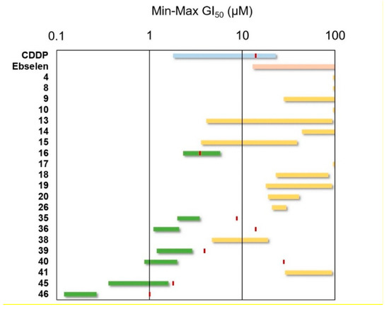 GI50 range plot of active compounds against human solid tumor cell lines and GI50 values against human fibroblasts (red bars). Cisplatin (CDDP) was used as reference anticancer drug. Ebselen was used as reference parental drug. Green colour indicates GI50 < 10 µM for all cell lines. Yellow colour indicates GI50 > 10 µM for some or all cell lines.