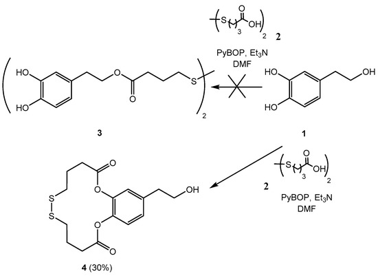 Unexpectedly, treatment of 1 with the same disulfide in the presence of PyBOP, a well-known peptide coupling reagent, did not furnish 3, but the 14-membered ring bicyclic derivative 4 in moderate yield (Scheme 1); presumably, the mild basic conditions provided by Et3N enhanced nucleophilicity of the phenolic hydroxyl groups compared to the aliphatic counterpart. 1H-NMR unambiguously proved that phenolic hydroxyl groups had been esterified, as protons H-2, H-5 and H-6 resonated above 7 ppm, as previously observed for acetylated olive polyphenols [45].