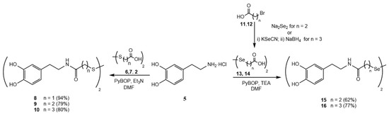 In order to analyse the influence of the chalcogen atom on the biological properties, the corresponding seleno-isosters 15, 16 were accessed (Scheme 2); they key diselenides 13 and 14 (n = 2, 3, respectively, Scheme 2) were obtained from the corresponding ω-bromo carboxylic acids by nucleophilic displacement with freshly-prepared Na2Se2 (reduction of elemental selenium black with NaBH4, for 13), or with KSeCN, followed by reduction with NaBH4 (for 14, Scheme 2). PyBOP-mediated peptide coupling with dopamine 5 afforded diselenides 15, 16, which were isolated in good yields (62% and 77%, respectively, Scheme 2).