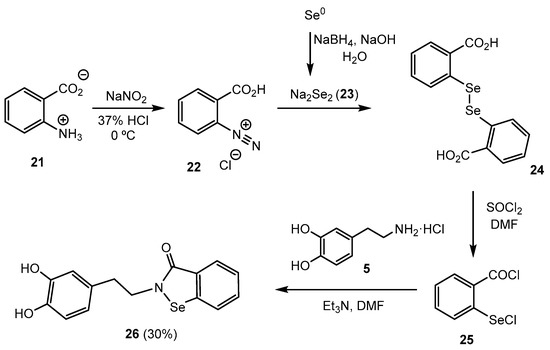 Treatment of anthranilic acid with sodium nitrite and HCl afforded diazonium salt 22, which was in turn coupled with in situ generated sodium diselenide to afford diselenide 24 (Scheme 4); reaction with thionyl chloride and DMF as a catalyst furnished transient aryl selenyl choride 25 [49]. Final coupling with dopamine hydrochloride 5 under basic conditions (Et3N) furnished ebselen derivative 26 in a moderate yield (30%) (Scheme 4).
