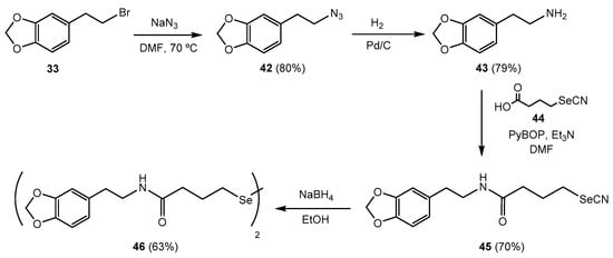 To a solution of 2-(3,4-methylendioxyphenyl)ethylamine 43 (194 mg, 1.17 mmol) in anhydrous DMF (3 mL), were added PyBOP (630 mg, 1.21 mmol), 4-selenocyanatobutanoic acid 44 (231 mg, 1.20 mmol) and anhydrous Et3N (0.25 mL, 1.80 mmol, 1.5 equiv.). The corresponding mixture was stirred overnight at rt, under Ar and in the dark. Then, the crude reaction was concentrated to dryness, and the residue was purified by column chromatography (CH2Cl2→80:1 CH2Cl2‒MeOH) to give 45 as an orange oil. Yield: 279 mg, 70%; RF 0.60 (EtOAc); 1H-NMR (300 MHz, CDCl3) δ 6.74 (d, 1H, J5′,6′ = 7.8 Hz, H-5′), 6.66 (brd, 1H, J2′,6′ = 1.6 Hz, H-2′), 6.61 (dd, 1H, H-6′), 5.92 (s, 2H, OCH2O), 5.62 (brs, 1H, NH), 3.46 (q, 2H, JH,H = 6.9 Hz, CH2N), 3.09 (t, 2H, JH,H = 6.8 Hz, CH2Ar), 2.72 (t, 2H, JH,H = 6.9 Hz, CH2CO), 2.31 (brt, 2H, J = 6.7 Hz, CH2), 2.20 (quint, 2H, CH2CH2CH2) ppm; 13C-NMR (75.5 MHz, CDCl3) δ 171.2 (CO), 148.0, 146.4 (C-3′, C-4′), 132.5 (C-1′), 121.7 (C-6′), 109.1, 108.5 (C-5′, C-2′), 101.9 (SeCN), 101.1 (OCH2O), 40.8 (CH2N), 35.4 (ArCH2), 34.8 (CH2CO), 29.1 (CH2Se), 26.5 (CH2CH2CH2) ppm; HRESI‒MS m/z calcd for C14H16N2NaO3Se [M+Na]+: 363.0218, found: 363.0218.