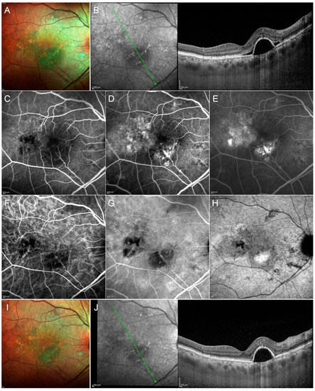 Multimodal imaging in a case of chronic CSC. Multicolor image (A) discloses multiple alterations together with the presence of fluid. Structural OCT scan through the fovea (green arrow) (B) shows a big pigment epithelium detachment (PED) with perilesional subretinal exudation and reflectivity changes localized at the level of the outer retinal bands. Fluorescein angiography discloses several hypofluorescent alterations in the early phase (C), becoming hyperfluorescent in the intermediate and late phases of the exam (D,E, respectively). Indocyanine green angiography highlights the changes of the choroidal vascular network in the early, intermediate and late phases (F–H, respectively). After photodynamic therapy with verteporfin, multimodal imaging discloses the regression of the subretinal fluid, with the permanence of the PED turning out to be stable in size (I,J, respectively).