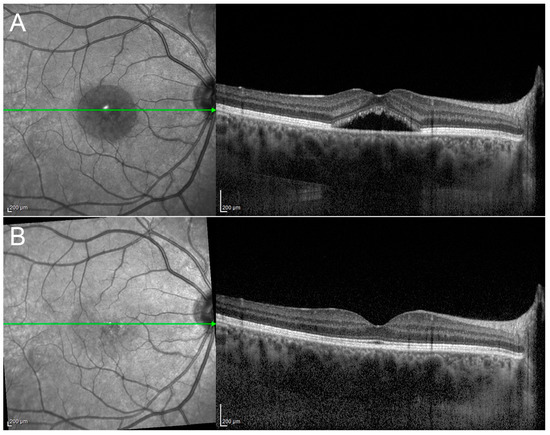 A case of acute CSC regression after eplerenone oral therapy. Structural OCT scan passing through the fovea (green arrow) shows a typical case of acute CSC, with a subfoveal fluid accumulation and an evident pachychoroid (A). After three months of eplerenone oral treatment, structural OCT discloses the complete regression of the subretinal fluid (B).