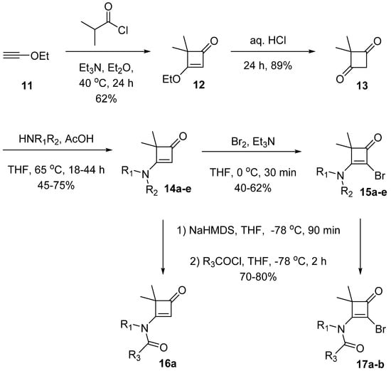 The synthesis of a small set of cyclobutenaminones was accomplished using a strategy based on that from Brand et al. (Scheme 1) [18]. The sequence began with ethoxyacetylene (11), which underwent a [2+2] cycloaddition [18,19,20,21] with the in situ generated ketene formed via the base-mediated HCl elimination from isobutyryl chloride. The two methyl groups were incorporated so as to restrict the nucleophilic character of enaminones (14a–e) to but one position in, e.g., the electrophilic bromination. The sequence furnished ethoxyenone (12) in moderate yield, which was transformed by acidic hydrolysis to 2,2-dimethylcyclobutane-1,3-dione (13) in high yield [18,19,20,21]. Next, dione 13 was condensed with various amines in the presence of AcOH as catalyst at 65 °C to generate the desired enaminones (14a–e) in moderate yields [18,22]. Bromination of all enaminones was achieved via electrophilic substitution using Br2 and base at 0 °C to produce bromoenaminones 15a–e [18,22]. Selected compounds were subjected to N-acylation via deprotonation of the secondary enaminone in tetrahydrofurane (THF) at –78 °C by sodium bis(trimethylsilyl)amide (NaHDMS), followed by subsequent trapping by the relevant acid chloride. Conceivably, the acylation of 14a to 16a could also take place at the nucleophilic vinylic position. However, the correct regiochemistry was proven by 2D NMR experiments. The acylations resulted in the corresponding N-acyl-cyclobutenaminones (16a and 17a–b) in good yields.