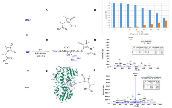 Labelling of (A) glutathione (GSH), (C) KGDHFPIC nonapeptide and (E) MurA with fragment 17a together with (B) the measured consumption of the fragment (blue columns) and the increasing amount of the GSH-adduct (orange columns) in the GSH-assay, (D) the MS/MS spectrum of the Cys-labelled nonapeptide indicating the Cys-labelling together with the theoretical and observed ion peaks and (F) the MS/MS spectrum of the digested MurA fragment (amino acids 104–120) labelled on Cys115 together with the theoretical and observed ion peaks. For E the 1UAE X-ray structure has been used [27].