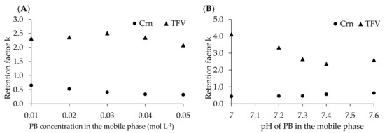 The influence of phosphate buffer (PB) concentration (A) and pH (B) in the mobile phase on the retention factors of creatinine (Crn) and tenofovir (TFV). Chromatographic conditions in Section 4.5.
