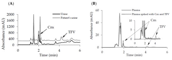 Representative chromatograms of: (A) urine, patient’s urine and patient’s urine spiked with TFV; (B) plasma and plasma spiked with Crn and TFV. Chromatographic conditions in Section 4.5.