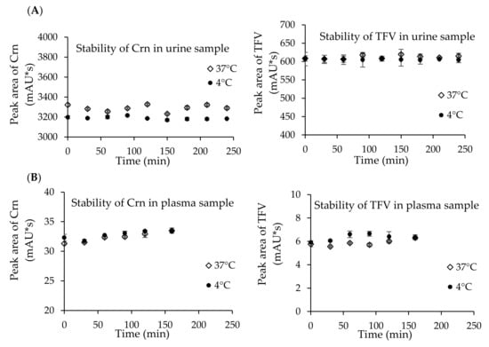 Stability of Crn and TFV in urine (A) and plasma (B) samples kept at 4 °C and 37 °C; n = 3 for each time point.