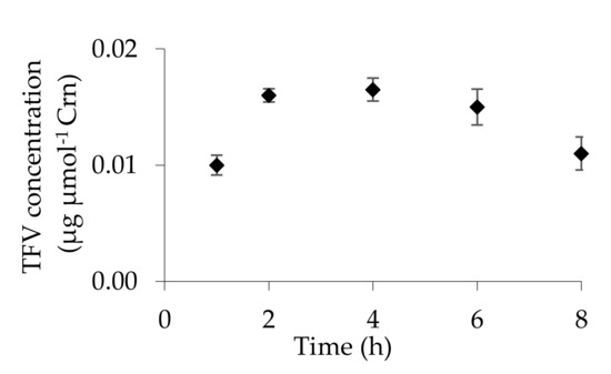 The newly elaborated analytical method was used to analyze urine samples collected from CHB patient treated with 123 mg drug dose. The study was mainly focused on the verification of TFV pharmacokinetic. The obtained results clearly indicate that the largest amount of TFV was excreted within 2 to 4 h after taking the drug, and gradually decreased to the eighth hour (Figure 4). Eight hours after the drug was administered, the amount of TFV became constant. It must be highlighted that having a limited number of patients, we cannot provide statistical data to discuss and clearly show a good trend of urinary TFV excretion. However, the validation data clearly indicate that the elaborated method would be useful to carry out this kind of study.