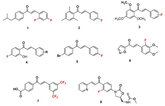 - Serdar, B.; Oztekin, A.; Arzu, G.; Derya, A.A.; Mahmut, U.; Busra, G.E.; Engin, K.; Aylin, D.; Gönül, A. Design of potent fluoro-substituted chalcones as antimicrobial agents. J. Enzyme Inhib. Med. Chem. 2017, 32, 490–495. [Google Scholar] [CrossRef]