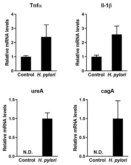 C57BL/6 mice were inoculated with H. pylori SS-1 to generate a model of H. pylori infection. In the pyloric antrum tissue, the increased expression of Tnfα and Il-1β mRNA, which are involved in H. pylori-induced inflammation [32], was more prominent in the infected group than in the control group (Figure 2). In addition, characteristics of gastritis were detected in the gastric tissue of the infected mice upon H&E staining (Figure 3).
