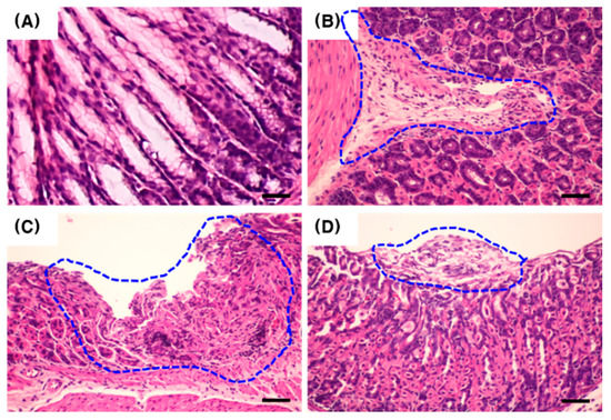 Histological analysis of hematoxylin and eosin-stained mouse gastric tissue after H. pylori SS-1 inoculation. H. pylori SS-1 was administered to C57BL/6 mice for 30 days. (A) uninfected control; (B) inflammatory cell infiltration (dotted line) in an H. pylori-infected mouse; (C) erosion (dotted line) in an H. pylori-infected mouse; (D) catarrhal inflammation (dotted line) in an H. pylori-infected mouse. Scale bar = 20 μm.