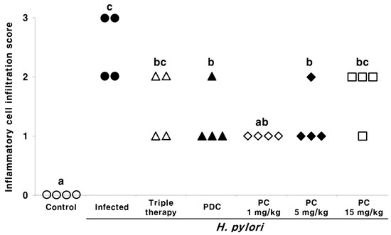 Effect of 3-pentylcatechol (PC) treatment on the histology of gastric tissue from H. pylori-infected mice (hematoxylin and eosin staining). Inflammatory cell infiltration was graded from 0 to 3: 0, normal; 1, mild; 2, moderate; 3, marked. ○, inflammatory cell infiltration score of control group; ●, inflammatory cell infiltration score of H. pylori-infected group; Δ, inflammatory cell infiltration score of H. pylori + triple therapy-treated group; ▲, inflammatory cell infiltration score of H. pylori + 3-pentadecylcatechol (PDC)-treated group; ◊, inflammatory cell infiltration score of H. pylori + 1 mg/kg of PC-treated group; ♦, inflammatory cell infiltration score of H. pylori + 5 mg/kg of PC-treated group; □, inflammatory cell infiltration score of H. pylori + 15 mg/kg of PC-treated group. Different letters (a, b, and c) indicate a significant difference (p < 0.05), ascertained via the Tukey–Kramer test.