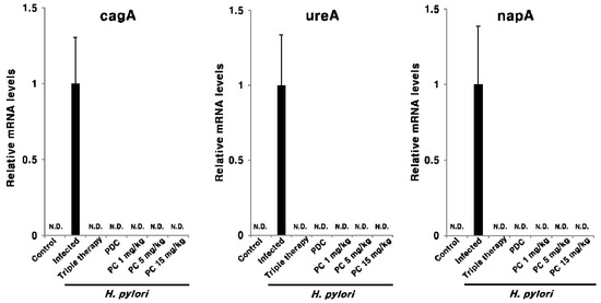 Effect of PC treatment on the expression of H. pylori cagA, ureA, and napA in the gastric tissue of the H. pylori-infected mice. N.D., not detected.