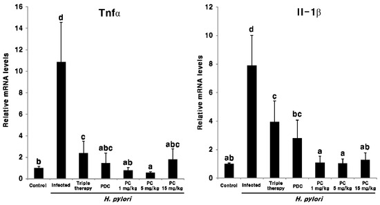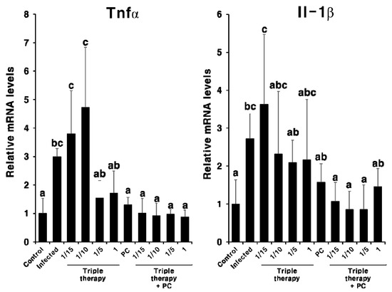 Expression levels of Tnfα and Il-1β mRNA in the gastric tissue of the H. pylori-infected mice after combination treatment with PC and triple therapy. Different letters (a, b, and c) indicate a significant difference (p < 0.05), ascertained via the Tukey–Kramer test. Triple therapy was administered at four concentrations. 1, Existing concentration of triple therapy (metronidazole and clarithromycin: 16.7 mg/kg; omeprazole: 700 μg/kg); 1/5, one-fifth of the existing concentration of triple therapy; 1/10, one-tenth of the existing concentration of triple therapy; 1/15, one-fifteenth of the existing concentration of triple therapy. PC was administered at 1 mg/kg.