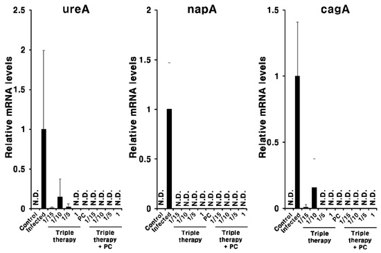 Expression of H. pylori ureA, napA, and cagA mRNA in the gastric tissue of the H. pylori-infected mice following combination treatment with PC and triple therapy. Different letters indicate a significant difference (p < 0.05), ascertained via the Tukey–Kramer test. Triple therapy was administered at four concentrations. 1, Existing concentration of triple therapy (metronidazole and clarithromycin: 16.7 mg/kg; omeprazole: 700 μg/kg); 1/5, one-fifth of the existing concentration of triple therapy; 1/10, one-tenth of the existing concentration of triple therapy; 1/15, one-fifteenth of the existing concentration of triple therapy. PC was administered at 1 mg/kg. N.D., not detected.