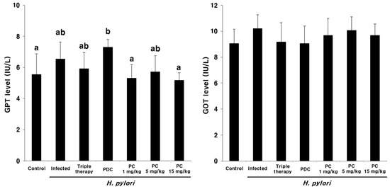 Plasma glutamate pyruvate transaminase (GPT) and glutamate oxaloacetate transaminase (GOT) levels after 3-pentylcatechol treatment. Different letters (a and b) indicate a significant difference (p < 0.05), ascertained via the Tukey–Kramer test.