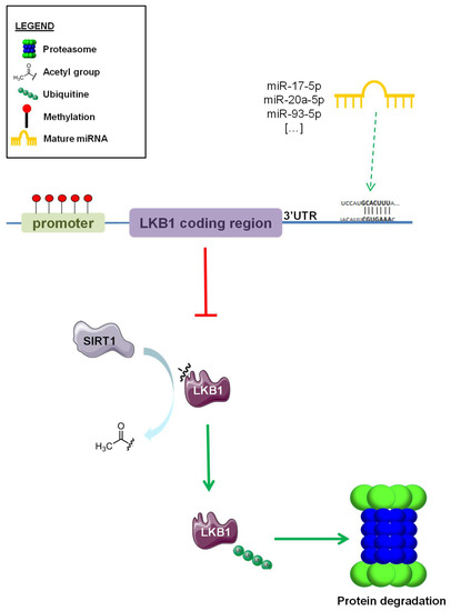 Epigenetic regulation of LKB1 expression. Different systems of epigenetic regulation of LKB1 protein expression. Promoter hypermethylation, miRNA-mediated modulation of LKB1 translation (i.e., miR-17-5p, miR-20a-5p, and miR-93-5p), and SIRT1-induced deacetylation and subsequent ubiquitination and proteasome degradation of LKB1. Green arrows indicate ubiquitination and proteasome degradation, red “T” arrow indicate inhibition of protein expression.